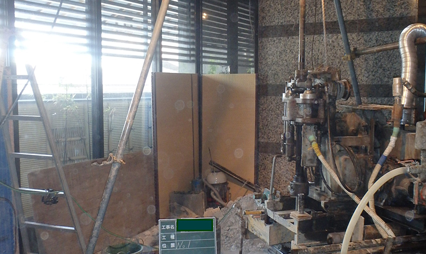 解体前のビル内においてボーリング調査を実施した事例であり、高い技術を用いて天井に穴を開けることなく調査を行っています。