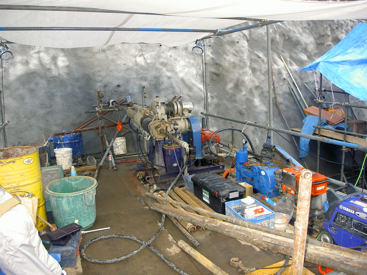 ボーリングマシンを地面に対して水平にセットすることで、山の斜面に孔(あな)を開けて調査を行った事例です。