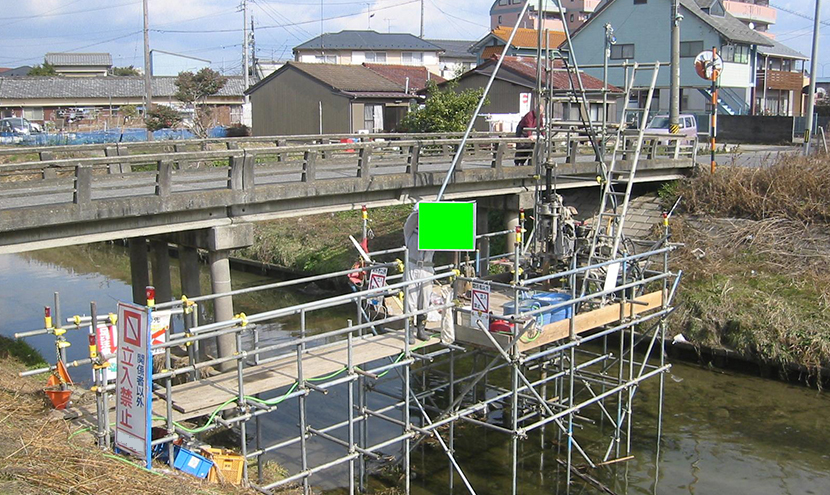 河川の上に足場を組み、水上でのボーリング調査を行った事例です。